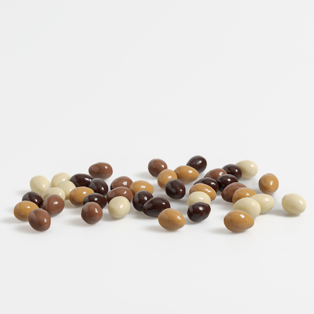 Sachet garni d’œufs nougatine chocolat noir, lait, blanc et blond.